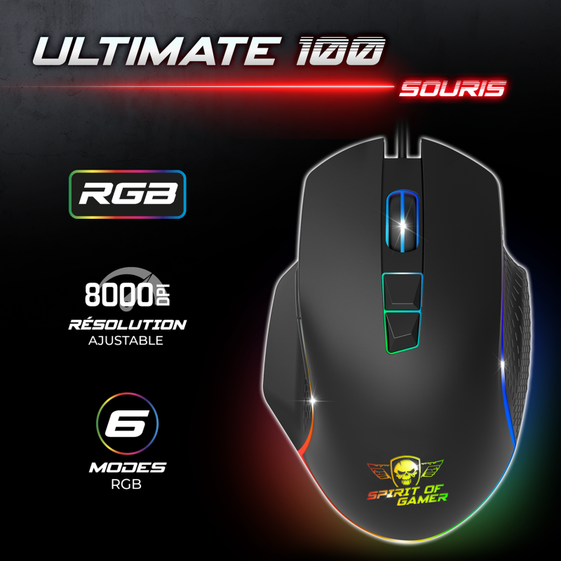 La souris Ultimate 100, équipée de 7 boutons programmables, d’un capteur réglable jusqu’à 8 000 DPI et de 6 modes RGB, garantit une réactivité optimale. Son logiciel dédié permet de personnaliser macros, performances et rétroéclairage selon votre style de jeu.