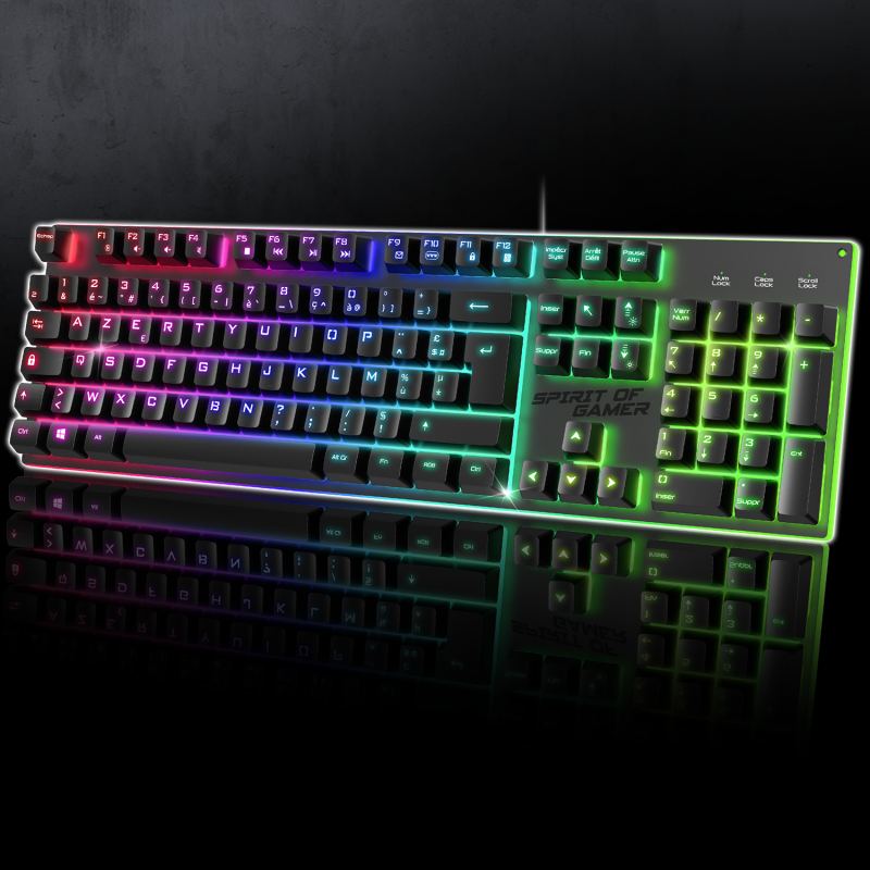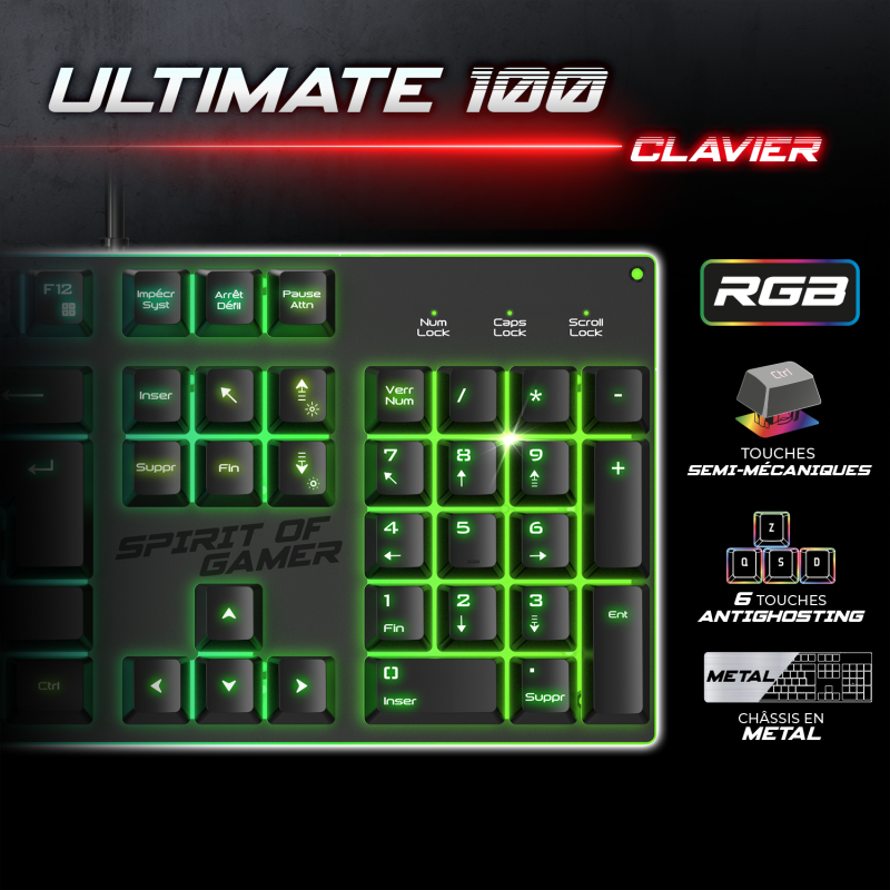 Le clavier Ultimate 100 propose 105 touches à membrane semi-mécaniques, un châssis métallique robuste, un rétroéclairage RGB réglable, ainsi que des raccourcis multimédia intégrés. Il convient aussi bien au gaming qu’à la bureautique.