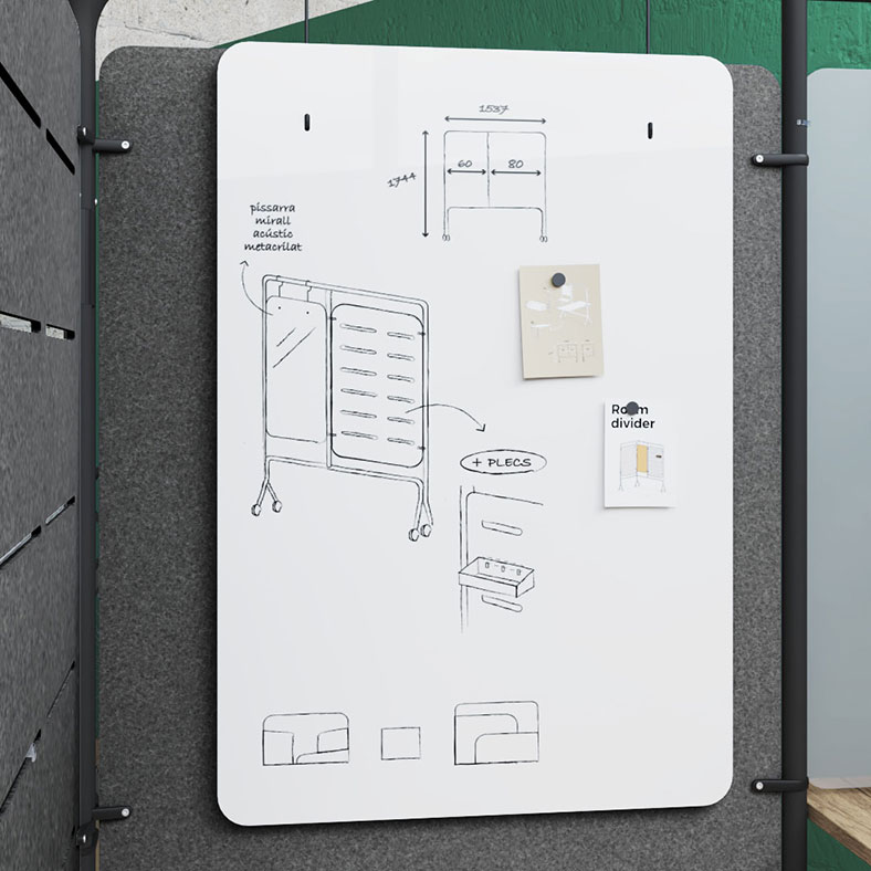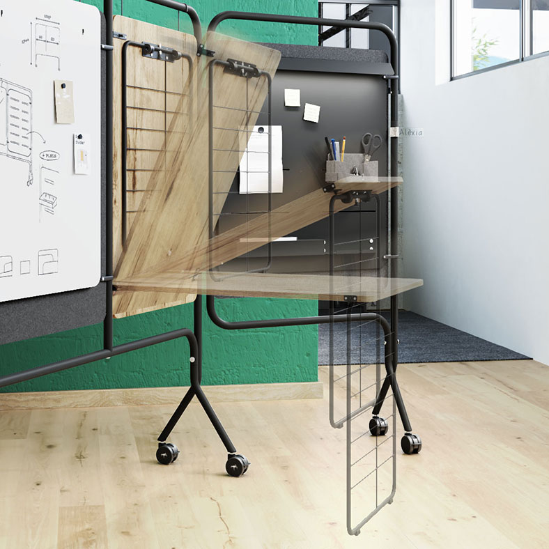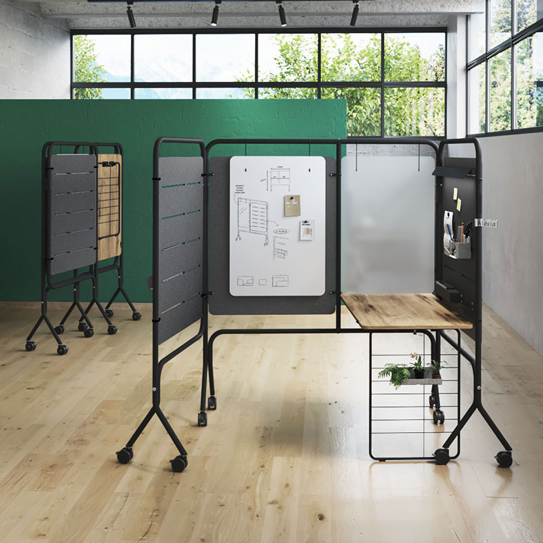 Grâce à sa structure métallique robuste et à ses extensions pliantes, il permet de créer facilement des zones de travail individuelles, des espaces de réunion informels ou des séparations temporaires. Les panneaux disponibles (acoustiques, méthacrylate, ardoise, miroir) offrent une grande liberté d’aménagement selon les besoins.